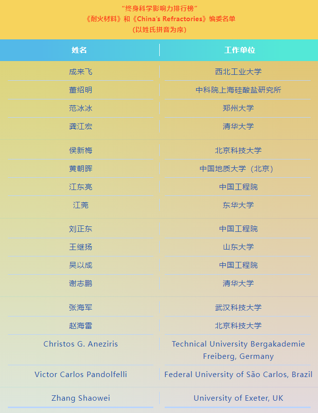 中鋼洛耐主管主辦的《耐火材料》與《China’s Refractories》雜志作為國內外學術行業的標志性品牌,為推動國內外學術進步和技術交流做出了積極作為,在推動全球耐火材料學科創新與發展中發揮了卓有成效的貢獻。此次多名編委入選2025年頂尖科學家榜單,既是對編委個人科研水平的高度認可,更印證了兩刊在全球耐火材料領域的學術話語權與國際影響力,中鋼洛耐將以兩刊為學術引領,打造行業頂尖智慧的學術交流平臺,為中國耐火材料學科的國際化發展持續注入強勁動力。